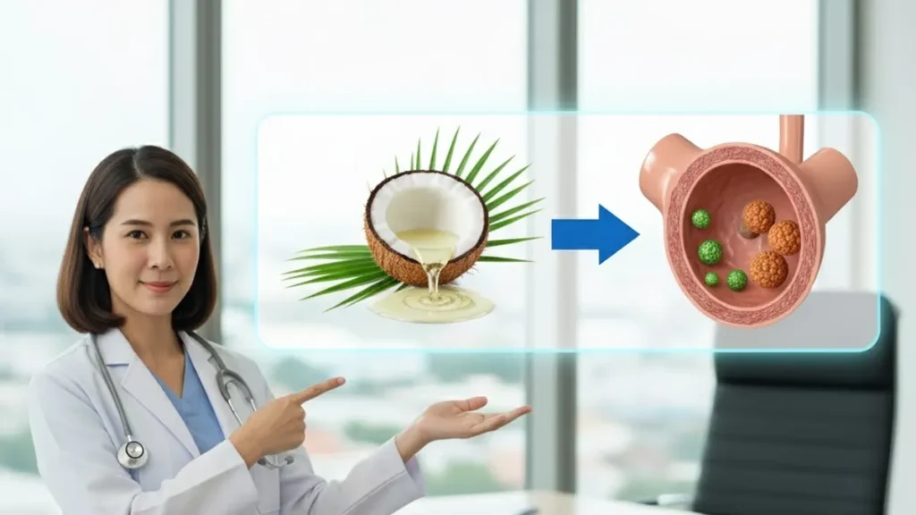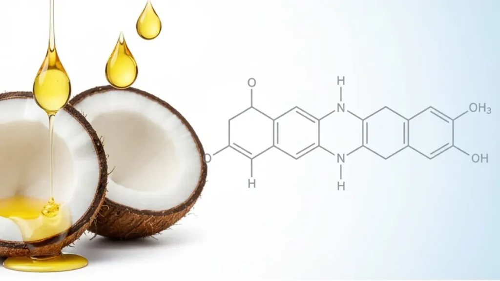 • กรดไขมันสายกลาง (Medium-Chain Triglycerides: MCTs): น้ำมันมะพร้าวมี MCTs ประมาณ 60-65% โดยเฉพาะ กรดลอริก (Lauric Acid) (ประมาณ 40-50%) ซึ่งเป็นกรดไขมันที่ถูกเผาผลาญในร่างกายแตกต่างจากกรดไขมันสายยาวที่พบในเนื้อสัตว์และผลิตภัณฑ์นม